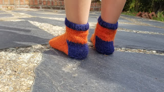 Anyway, after I finished knitting the matching striped socks, I looked at June's feet and then my own feet and realized that even though she's a child, her feet are only slightly smaller than mine.